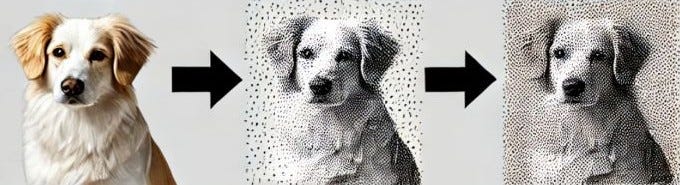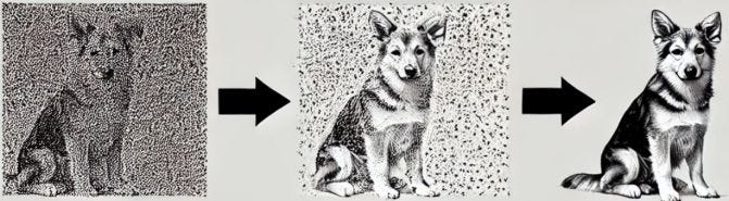 - Noise Addition: Given an original data sample (e.g., image of the dog above), Gaussian noise is incrementally added over multiple steps.